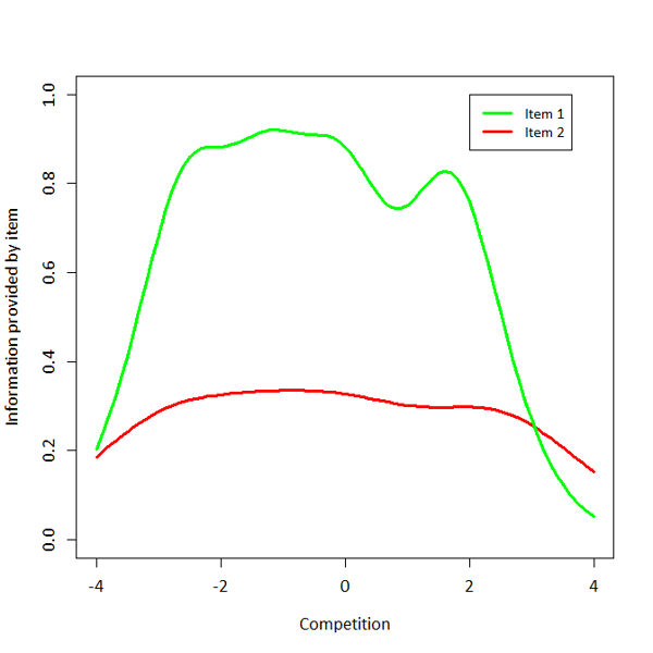 Whether an item is ‘better’ is determined in terms of IRT by the amount of information an item yields, given a person’s score for a latent trait (such as Competition). The item characteristics of an item determine how much information each item yields for each value of theta. Figure 2 more clearly shows the way this works.