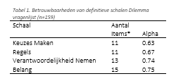 De betrouwbaarheid van een vragenlijst geeft een indicatie van de nauwkeurigheid van het instrument. Het begrip heeft betrekking op de reproduceerbaarheid van de gemeten uitkomsten. Een van de meest gebruikte betrouwbaarheidsmaten voor een vragenlijst als Morele Dilemma’s is Cronbach’s alfa. Dit is een maat voor interne consistentie (Nunnally, 1978). In Tabel 1 worden de betrouwbaarheden van de vier schalen vermeld.