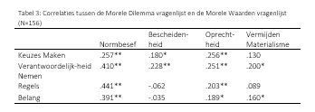 Daarnaast is de relatie tussen Morele Dilemma’s en de Morele Waarden vragenlijst onderzocht (Tabel 3). Ook hier zijn de gevonden relaties goed te verklaren. De hoogste correlaties vinden we over het algemeen bij de schaal Normbesef: het hanteren van bepaalde normen is vaak leidend bij de keuzes in morele dilemma’s. Normbesef heeft de hoogste correlatie dan ook met de schaal Regels: personen die een groter normbesef hebben zijn over het algemeen dus ook strikter in het hanteren van die normen (regels) bij morele dilemma’s. Ook de positieve correlaties tussen Keuzes Maken en Verantwoordelijkheid nemen enerzijds en Oprechtheid anderzijds zijn verklaarbaar. Het is te verwachten dat personen die oprecht zijn ook oprecht zijn in hun keuzes en achter hun keuzes staan, dat wil zeggen verantwoordelijkheid nemen voor hun genomen keuzes.