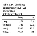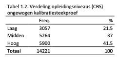 Uiteindelijk zijn deze groepen gecombineerd in drie categorieën die zo goed mogelijk de categorieën van het CBS weerspiegelen. Deze categorieën zijn weergegeven in de uiterst rechter kolom. De verdeling in opleidingsniveaus over deze drie categorieën is weergegeven in Tabel 1.2.