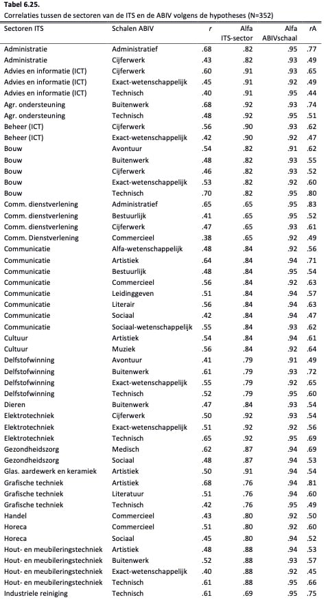 Volgens verwachting zijn er hoge correlaties tussen de taken van de ITS en schalen van de CarrièreWaarden. Dit geeft aan dat de taken van de ITS meten wat iemand leuk vindt om te doen in werk.